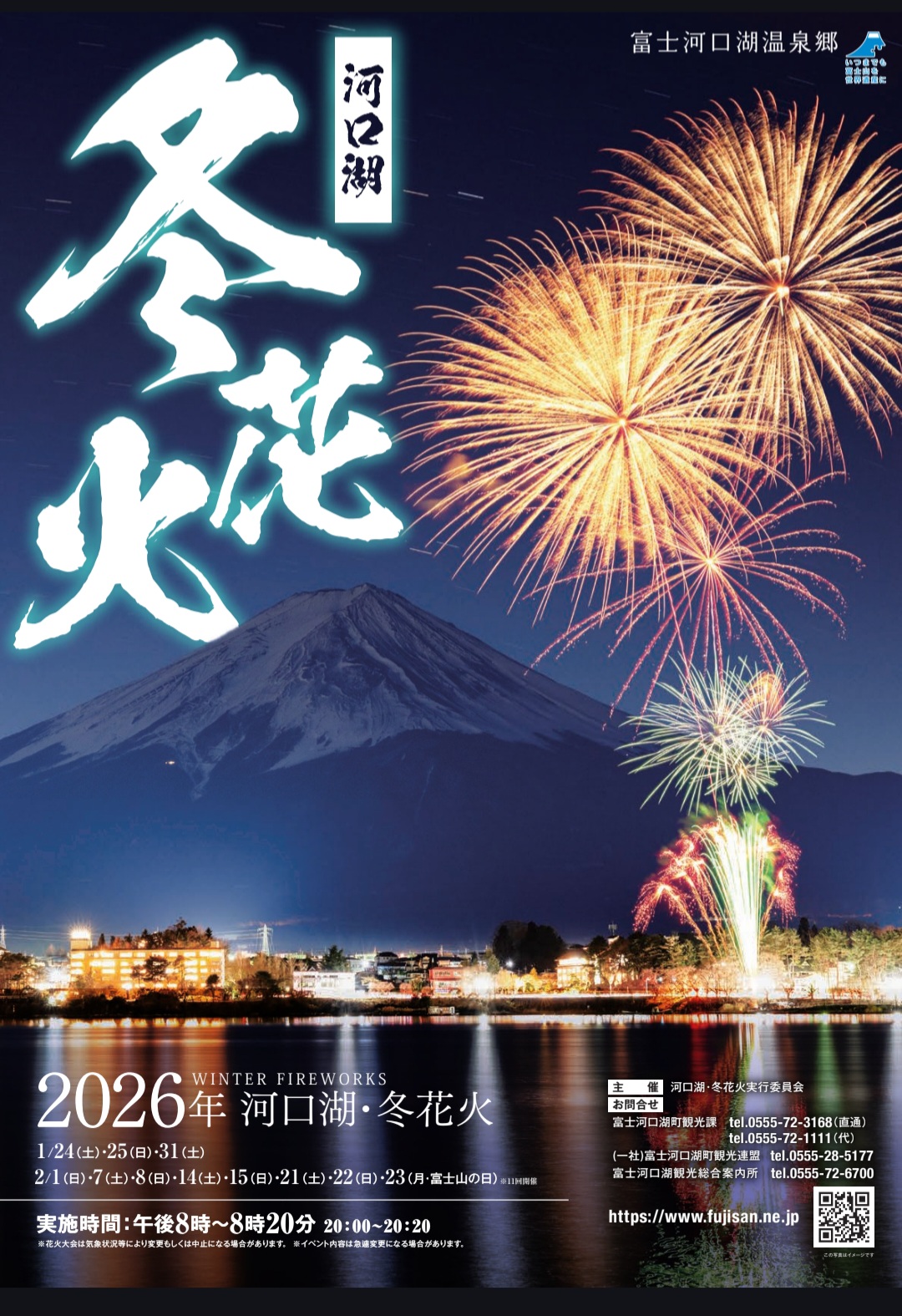 こんにちは! TABIJIYAスタッフです! 2026年1月24日から2月23日までの土曜・日曜(全11回)で河口湖の冬花火が開催されます!冬の河口湖を彩る毎年恒例の大人気イベントです! キッチンカーも出店するので、おいしいものを食べながら冬花火を楽しみましょう! 開催会場:大池公園(メイン会場)、畳岩、八木崎公園 開催時間:午後8時から8時20分 ホテルTABIJIYAから河口湖までは車で約15分です!